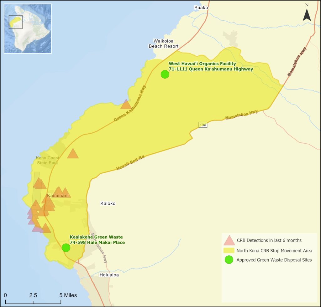 Hawaiʻi County, in coordination with Hawaiʻi Department of Agriculture, is issuing a 3-month voluntary compliance order for parts of West Hawaiʻi — effective July 1 through Sept. 30 — to stop the movement of host materials for the invasive coconut rhinoceros beetle.