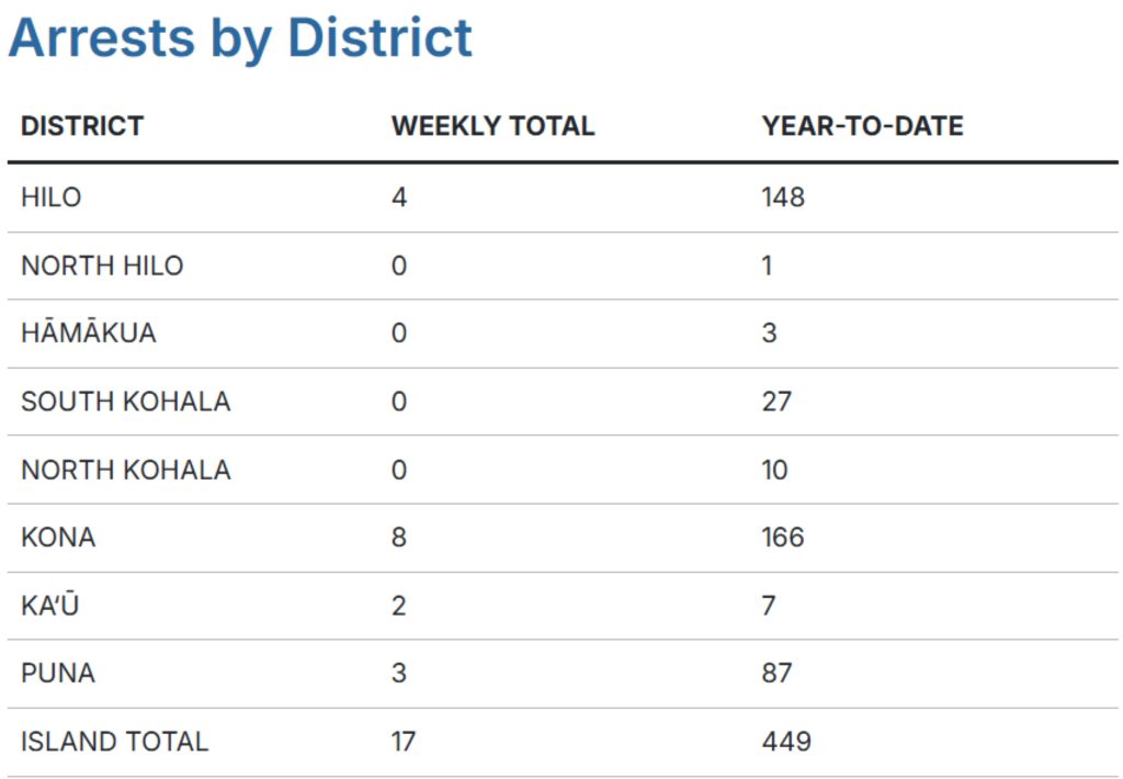 The most DUI arrests per district during the week were made in Kona with 8 followed by Hilo with 4 and Puna at a close third with 3 to round out the top three.
