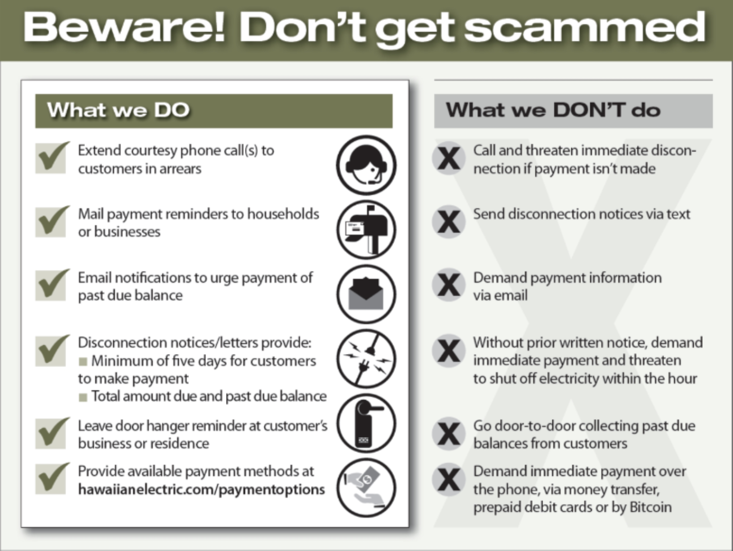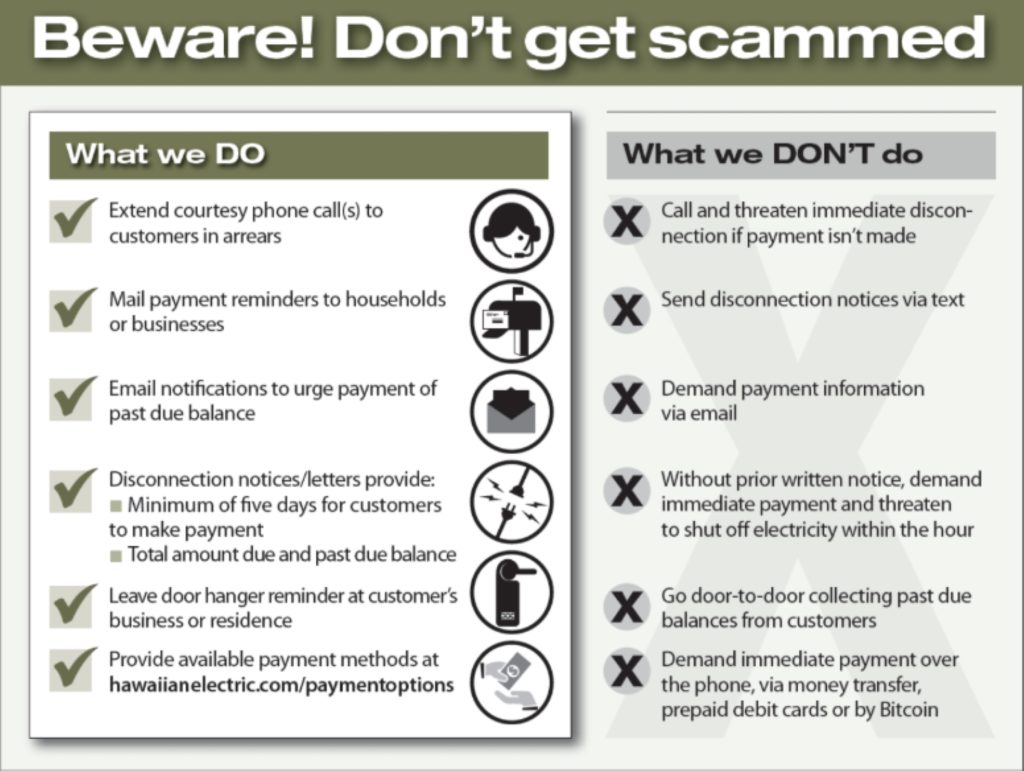 “Scammers are constantly updating their arsenal, so it’s critical for all customers to stay alert and vigilant. Don’t let a scammer’s threat of disconnection make you a victim,” said Hawaiian Electric Vice President of Customer Service Brendan Bailey in an announcement about the scam.