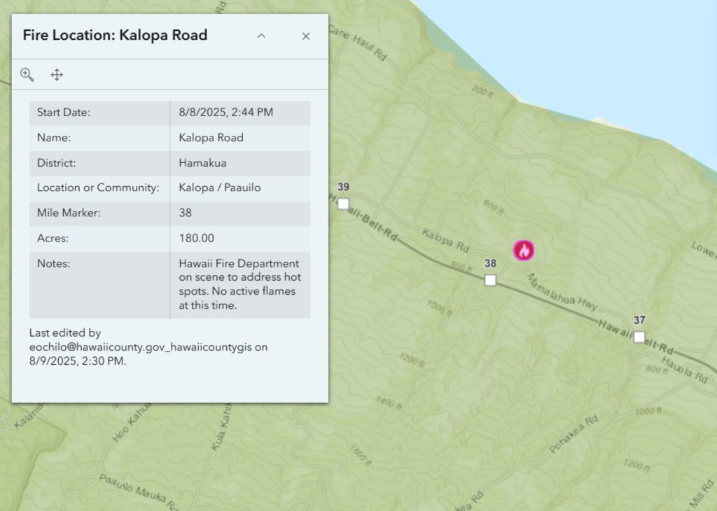 Big Island firefighters also responded to wildfires Thursday and Friday, Aug. 7-8, in an area about 15 to 20 miles away to the north and west of Saturday’s fire, between the 36- and 39-mile markers near Pa‘auilo in Hāmākua.
