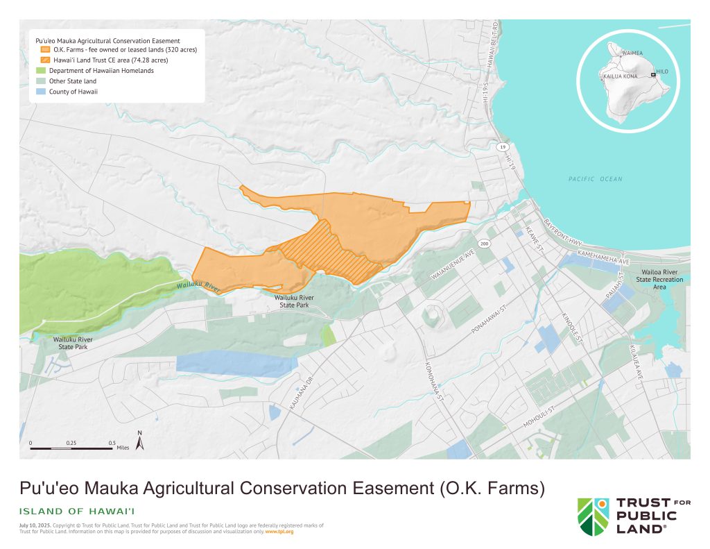 Now, that mission to enhance local food security is assured with the Keolanui family purchasing more than 74 acres of the farm with help from the Hawai‘i Land Trust and Trust for Public Land. The purchase included establishing the Pu‘u‘eo Mauka conservation easement, which mandates the land remain a productive agricultural land in perpetuity.