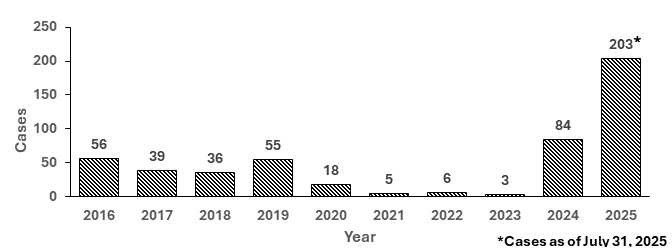 As of July 31, 2025, the department has identified 203 cases of pertussis — more than double the 84 cases identified in all of 2024.