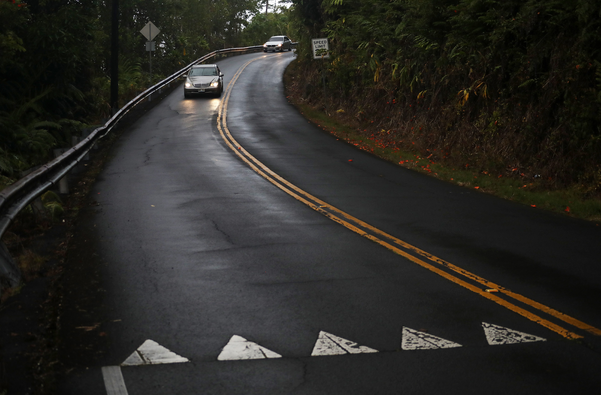 Cars drive down Kaiwiki Drive in Hilo on Aug. 12, 2025. There is no shoulder for pedestrians. (Kelsey Walling/Big Island Now)