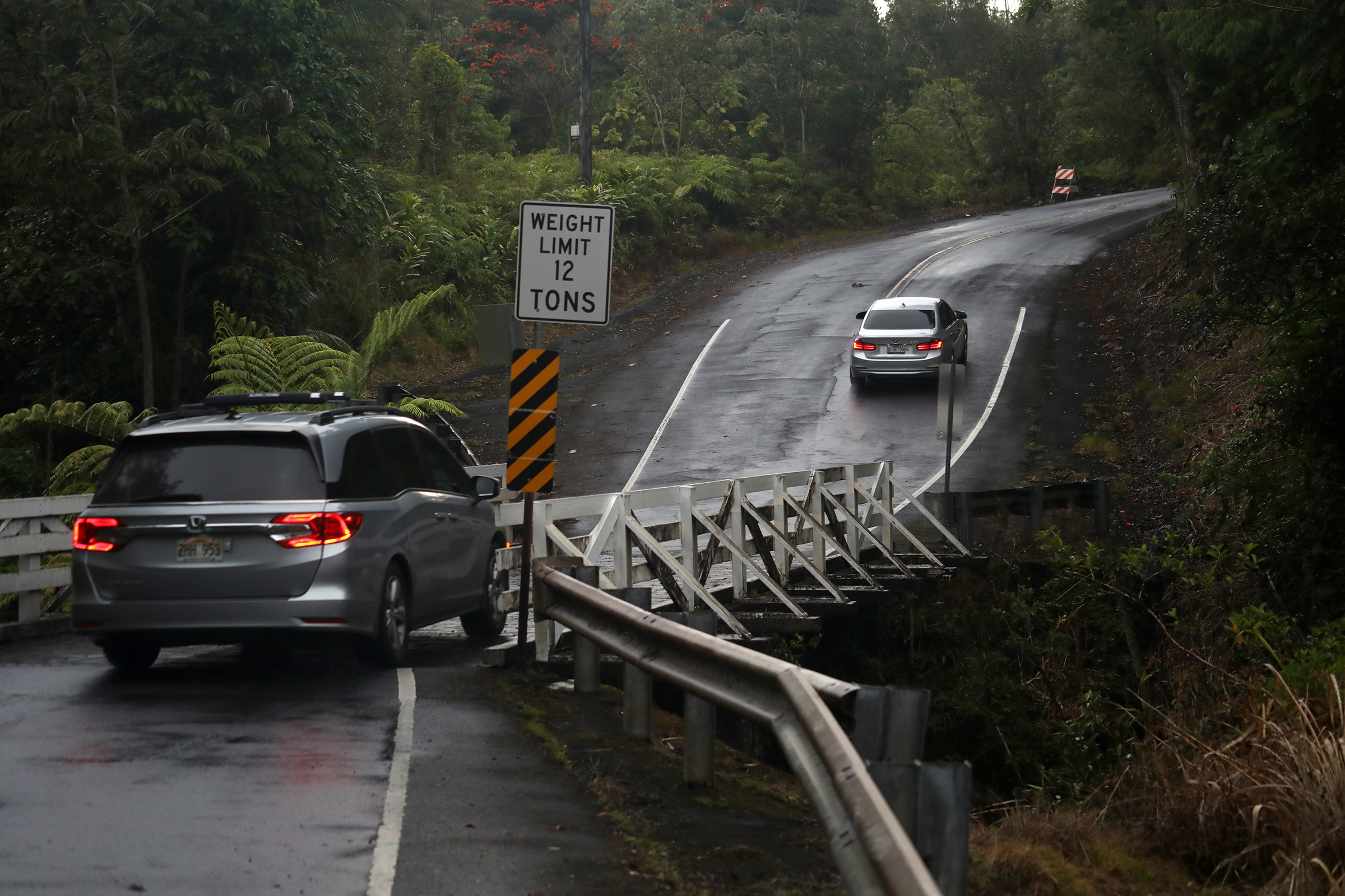 Cars drive over the wooden bridge rated for 12 tons on Kaiwiki Road in Hilo on Aug. 12, 2025. There is no shoulder for pedestrians. (Kelsey Walling/Big Island Now)