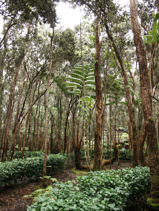 Tea grows under a canopy of native trees at Tea Hawaiʻi & Company in Volcano. (Courtesy of Tea Hawaiʻi)