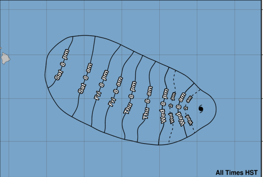 The projected forecast has the eye of the hurricane passing north of the Hawaiian Islands, beginning on Tuesday.