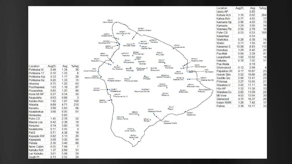 Most of Hawaiʻi Island was below average rainfall for August, with the seasonable exception of the leeward coast/slopes of the Kohala and Kona districts which turned in another month with many sites near to above average, according to the National Weather Service.