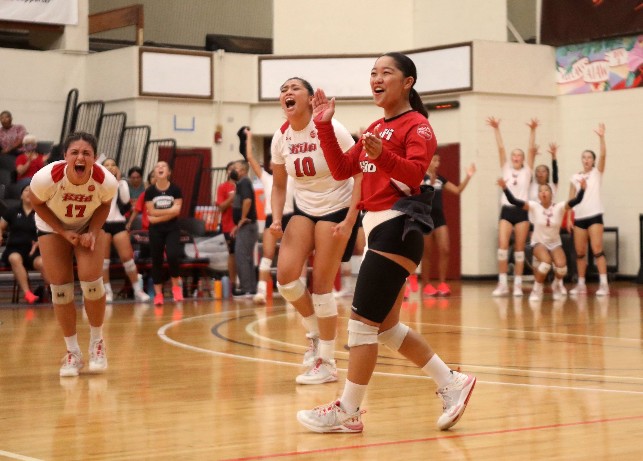 UH Hilo celebrates a kill against Holy Names on Tuesday, Oct. 11, 2022. (File photo: Kelsey Walling)