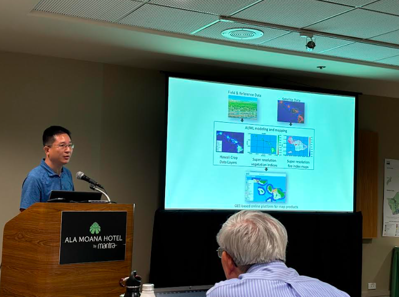 Professor Qi Chen speaking at a workshop to gather feedback for the first prototype of the Hawaiʻi Cropland Data Layer maps. (Courtesy of the University of Hawaiʻi at Mānoa Department of Geography and Environment)