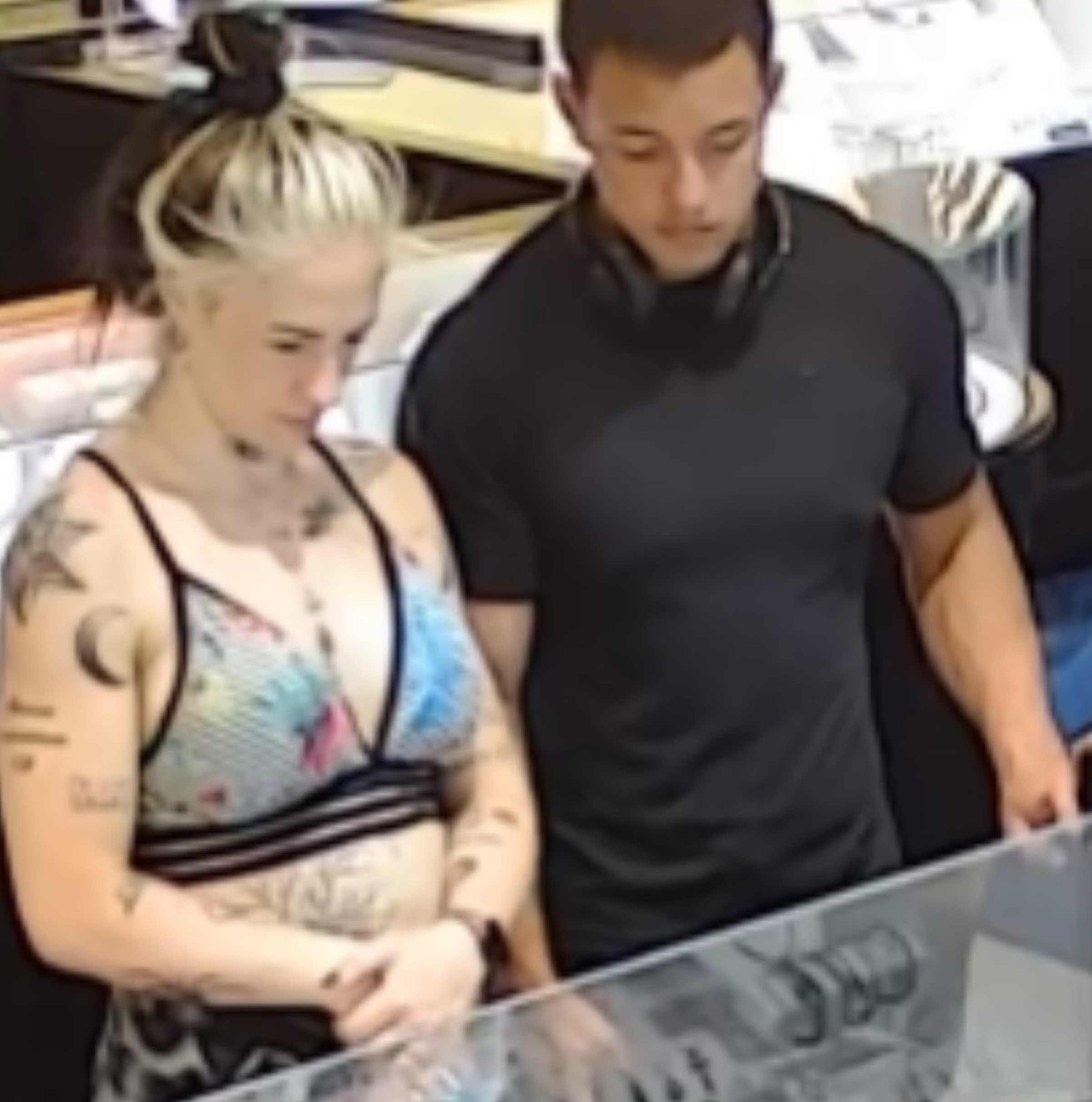 The woman accompanying the man is 5-foot-9, about 170 pounds, Caucasian, with long blonde/brown hair, a large build and numerous tattoos on her abdomen, chest and both arms.