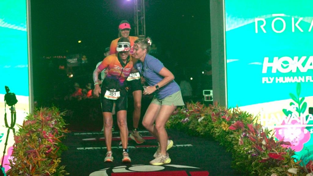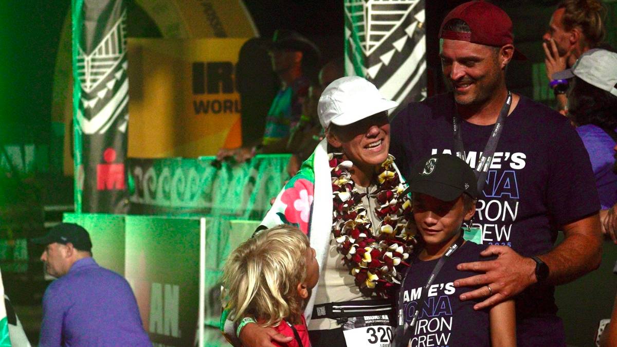 Shortly after Avery’s crossing, another Big Island resident finished: Jamie Ronning, who was greeted with plumeria lei by her two children and husband.