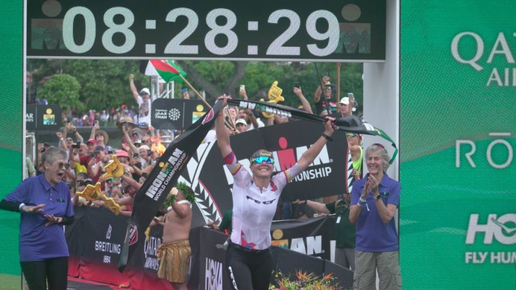 • Solveig Løvseth of Norway captures the top podium during the Women’s Ironman World Championship on Oct. 11, 2025, in Kailua-Kona. (Tiffany DeMasters/Big Island Now)