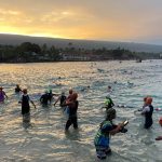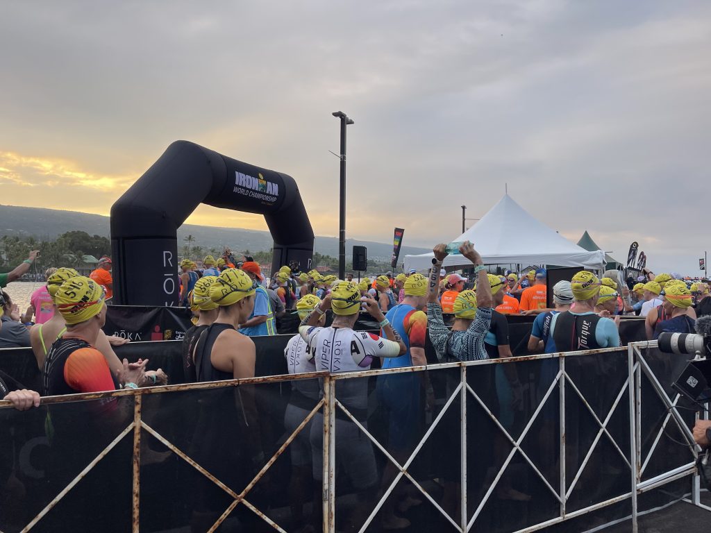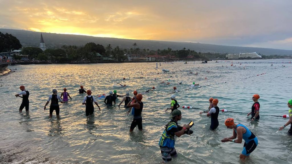 Approximately 1,600 triathletes competing from around the world took to the grueling 140.6-mile course. Waters in Kailua Bay were slightly choppy, highlighted pink as the sun rose over Hualālai.
