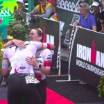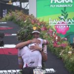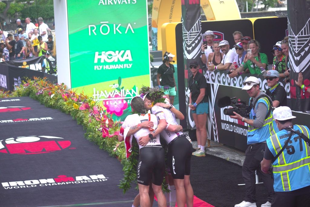 • Norway’s Solveig Løvseth embraces Laura Philipp of Germany at the finish line of the Ironman World Championship in Kona on Oct. 11, 2025. (Tiffany DeMasters/Big Island Now)