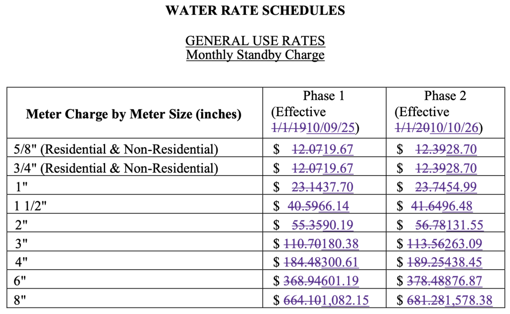 Residential and non-residential customers will see an increase of 47.89% for monthly water usage on 5/8-inch and 3/4-inch meters from $12.07 to $19.67.