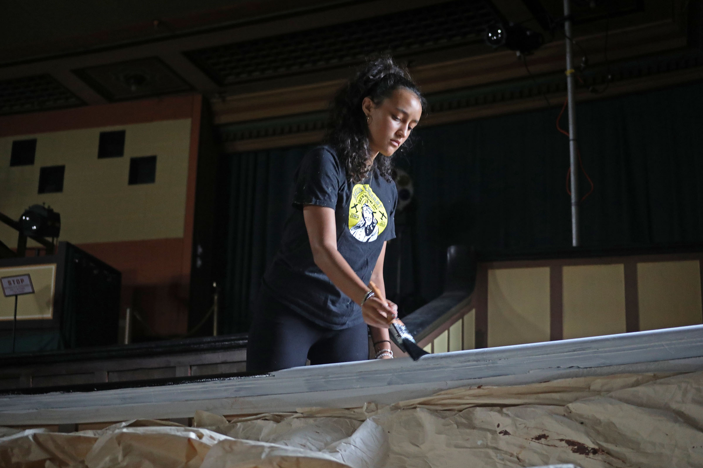 Eva Brewer paints the bannister at the Hilo Palace Theater as part of its centennial renovations. (Kelsey Walling/Big Island Now)