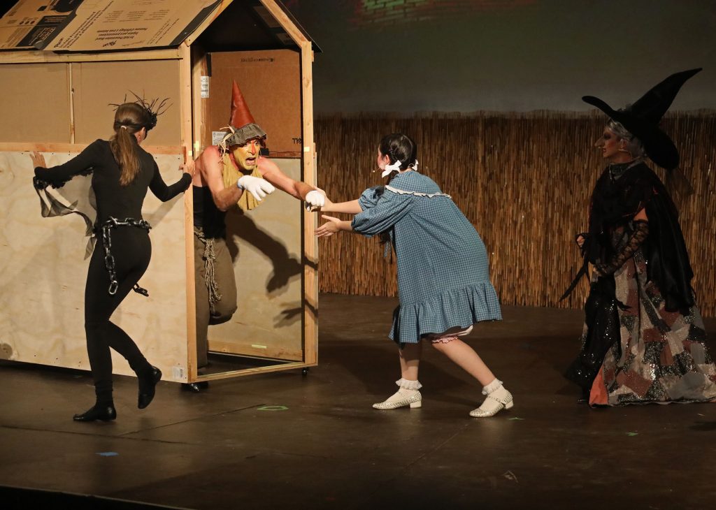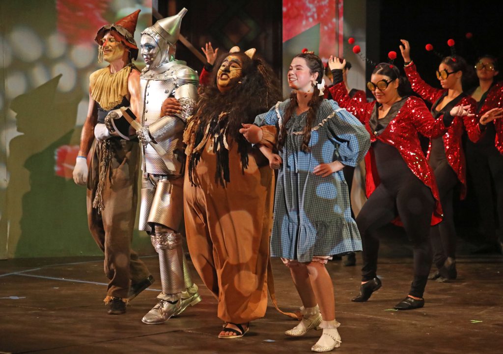 Danny Randerson as Scarecrow, Lenx Neves as Tin Man, Pōmai Conant-Longakit as Cowardly Lion and Tarani Best as Dorothy Gale link arms while performing during a dress rehearsal for the Wizard of Oz on Monday, Sept. 29, 2025. (Kelsey Walling/Big Island Now)