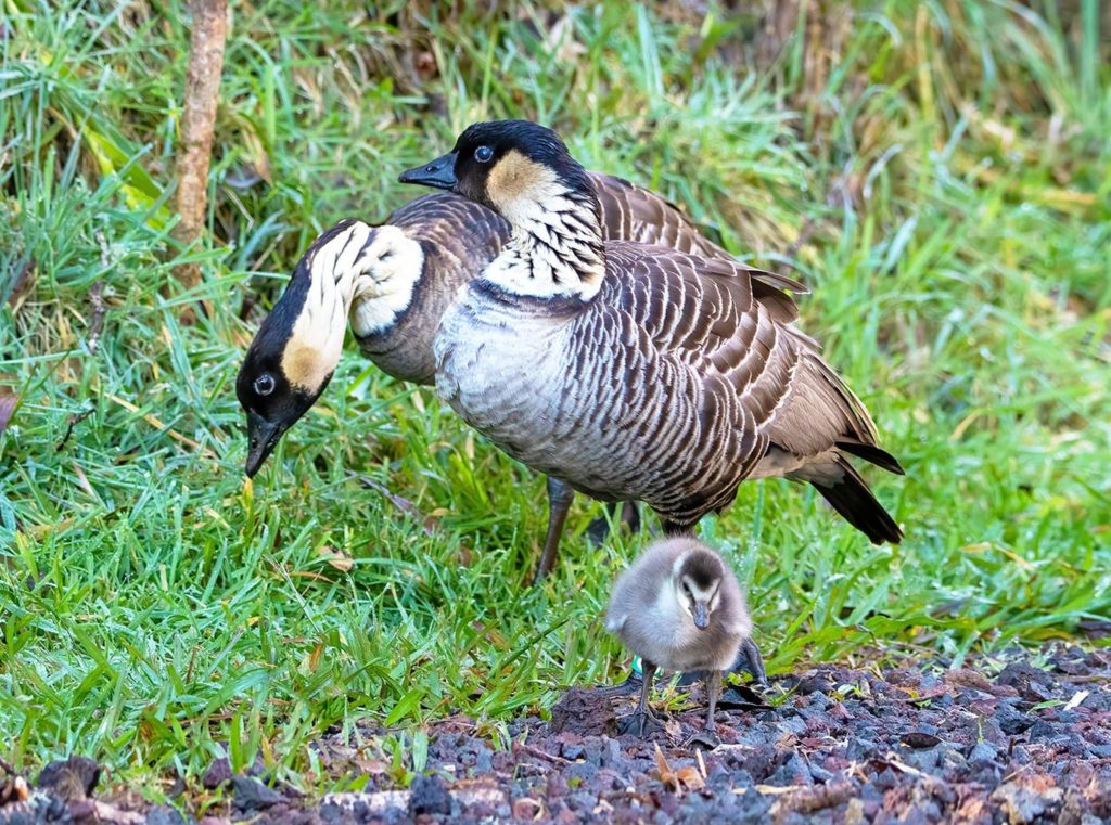 • A family of nēnē, or native Hawaiian geese, is pictured at Hawai’i Volcanoes National Park. (Photo Courtesy: Hawaiʻi Pacific Parks Association/By Janice Wei)