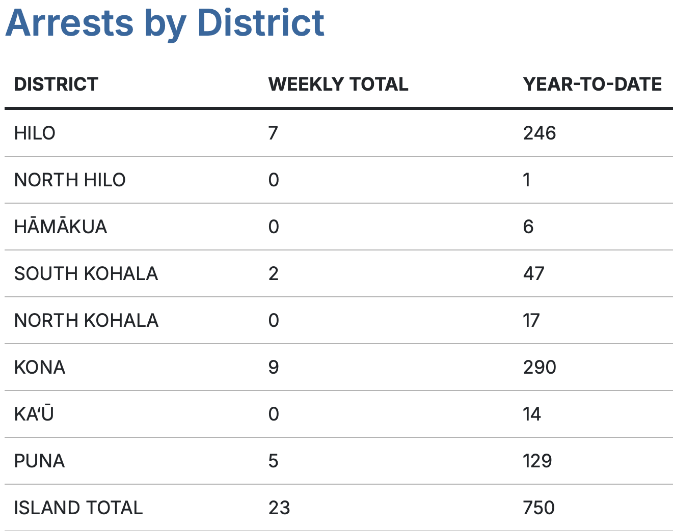 Seven of the drivers were involved in a traffic crash, according to a news release from Hawai‘i Island police. None of the drivers was under the age of 21. Most of last week’s DUI arrests occurred in Kona, with nine.