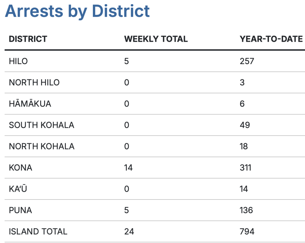 Most of the arrests occurred in Kona, with 14 people taken into custody. There were five arrests in Hilo and five in Puna.