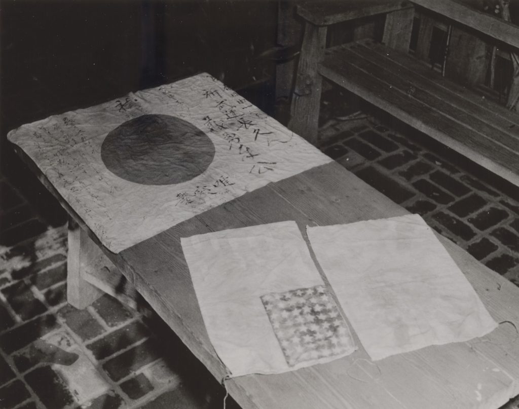 Displayed on a table are a large flag of Japan and two smaller flags. One of the smaller flags is a very tattered American flag; the other is so faded it’s hard to see the print, but it appears to be the ensign of the Imperial Japanese Navy — a sun with rays.
