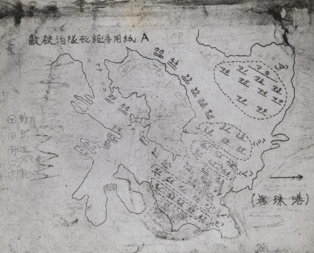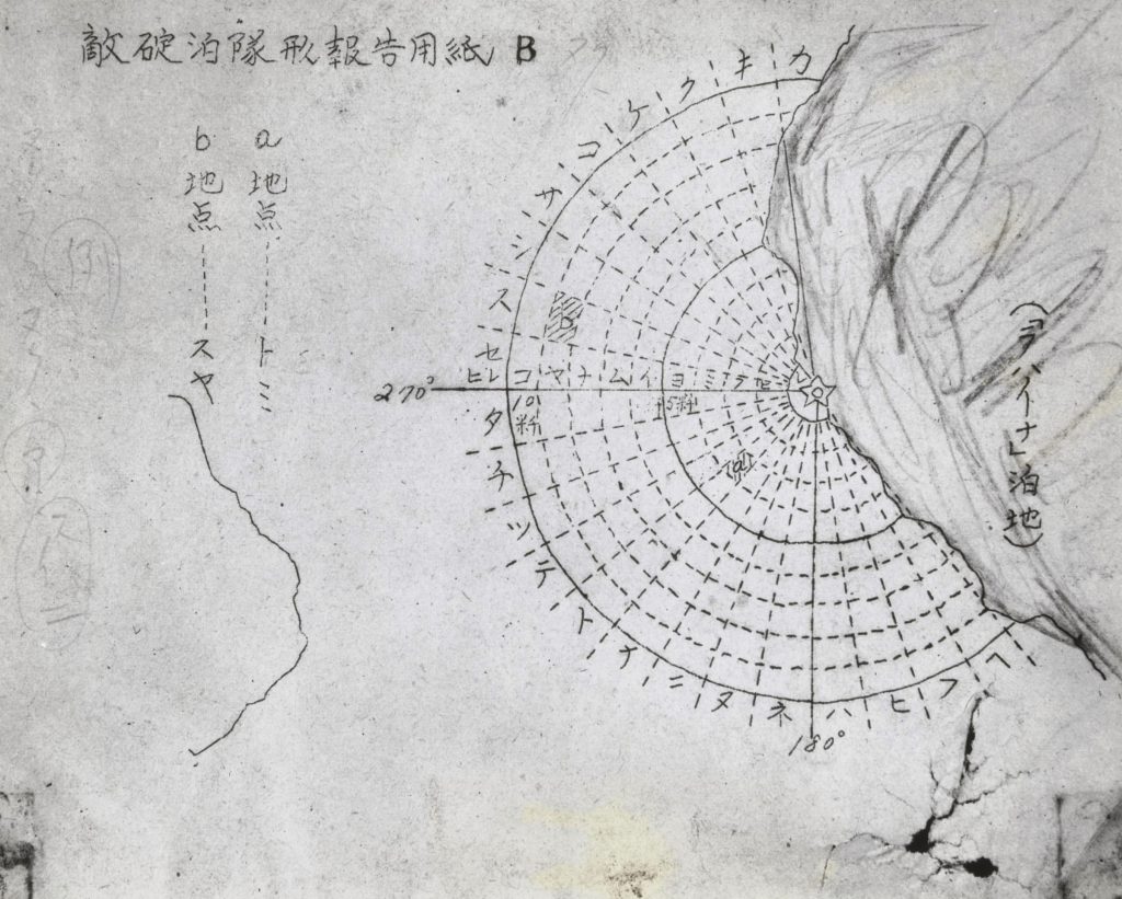 Two images show maps recovered from one of the planes. The kanji on one map reads “Enemy anchorage formation report form.” The characters on the other similarly say “Enemy anchorage formation report form B.”