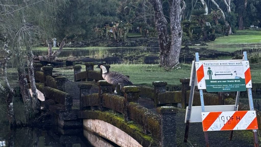 A nēnē that lost her mate in 2024 after it was hit by a car has found a new partner and nesting in Hilo’s Lili‘uokalani Gardens.