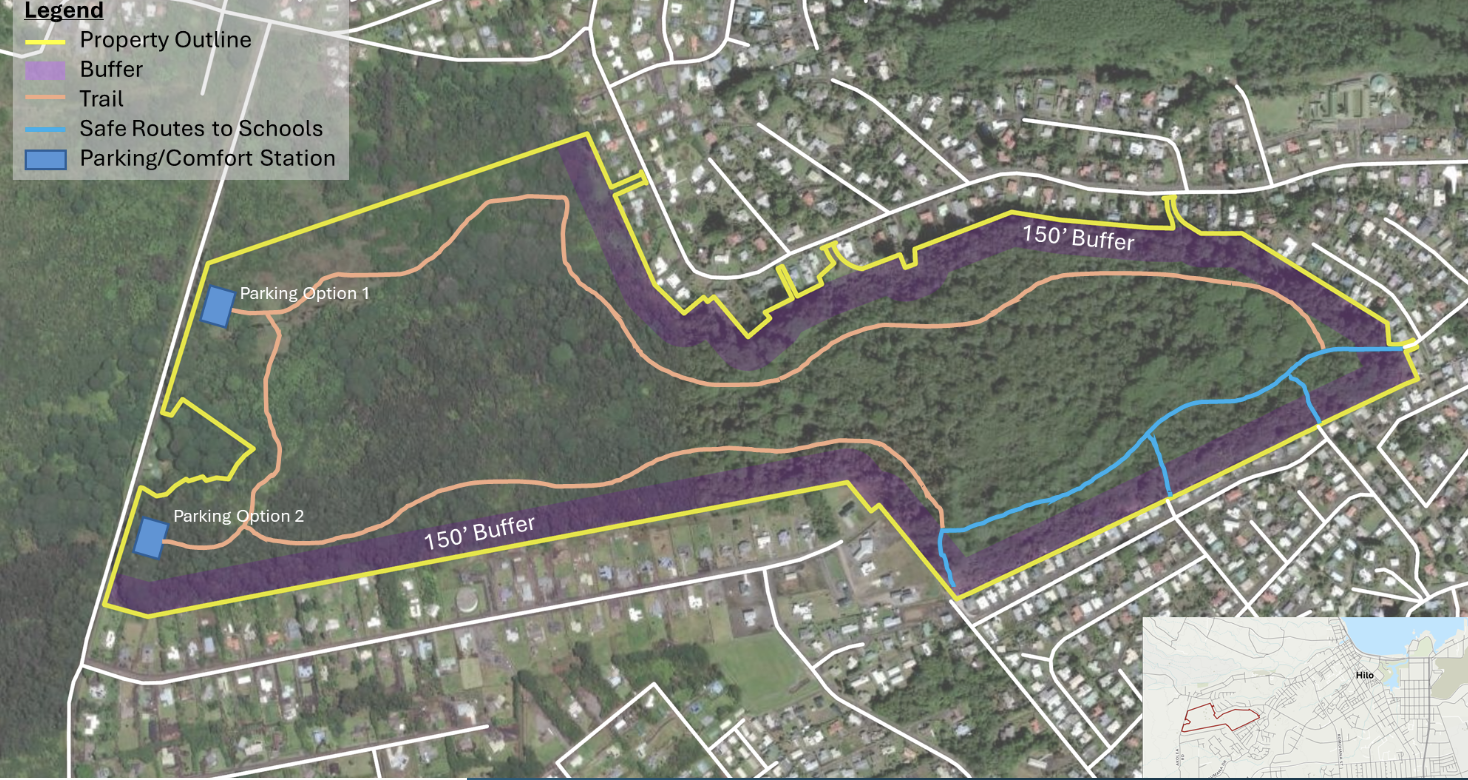 “The state has ample capacity for $2.25 million for nearly 300 acres of land to be green space in perpetuity, which is a very good deal,” Kusch said. “The Division of State Parks is hugely supportive of this idea, especially since Boiling Pots and Rainbow Falls already have people who can service restrooms, mow and police the area. They see this as an important thing for Hilo.”