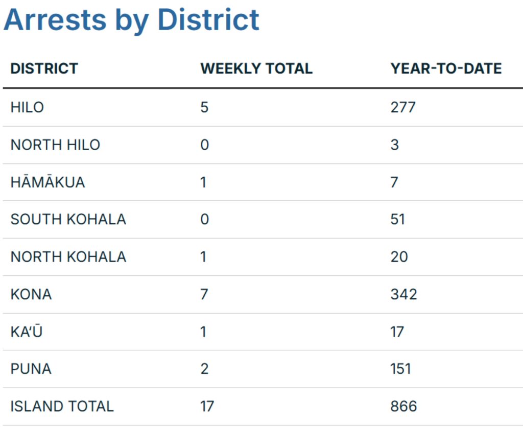 Hawai‘i Island police continue their crackdown on those who drive impaired, arresting 17 motorists for driving under the influence of an intoxicant during the week of Dec. 8-14.