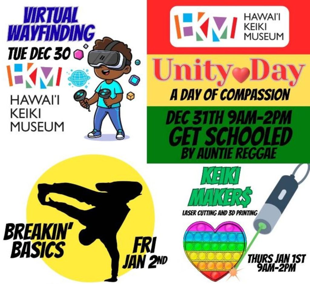 Designed for kids between 8 and 14 years old, this week of workshops will provide opportunities to enjoy Unity Day and count down to New Year’s Day, plus learn about ecology and the natural world, virtual reality wayfinding, 3-D printing and laser cutting, even breakdancing. More info/registration: Visit the Hawai‘i Keiki Museum website.