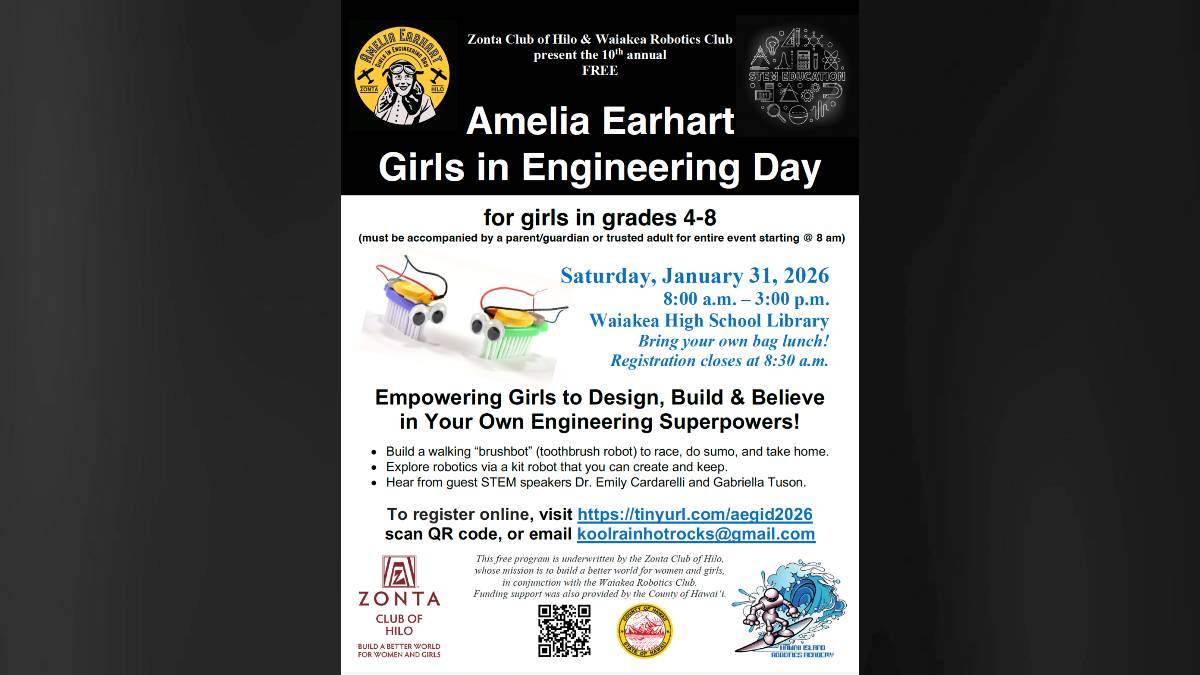 “The Amelia Earhart Girls in Engineering Day supports fourth- to eighth-graders to continue [science, technology, engineering and mathematics] curriculum throughout middle school and high school,” said Zonta Club of Hilo Event Chairperson Deb Lewis in an announcement about the event, adding it also encourages the girls to pursue college degrees in those fields.