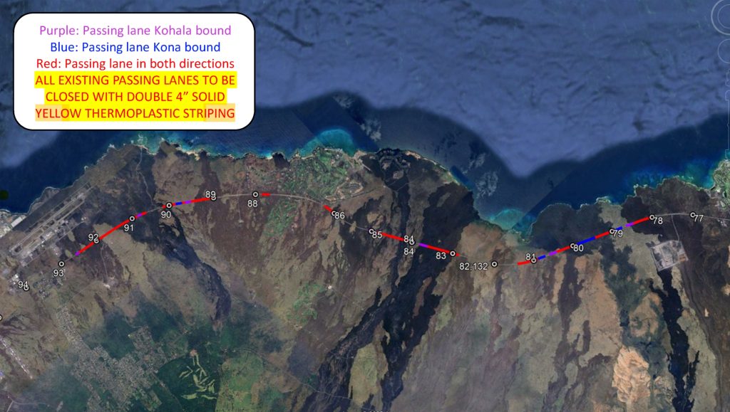 Hawai‘i Department of Transportation is removing passing zones between mile posts 78 and 92.6 — in the vicinity of Waikōloa Beach Drive and Keāhole Airport Road — on Queen Kaʻahumanu Highway, also known as Highway 19, in Kona.