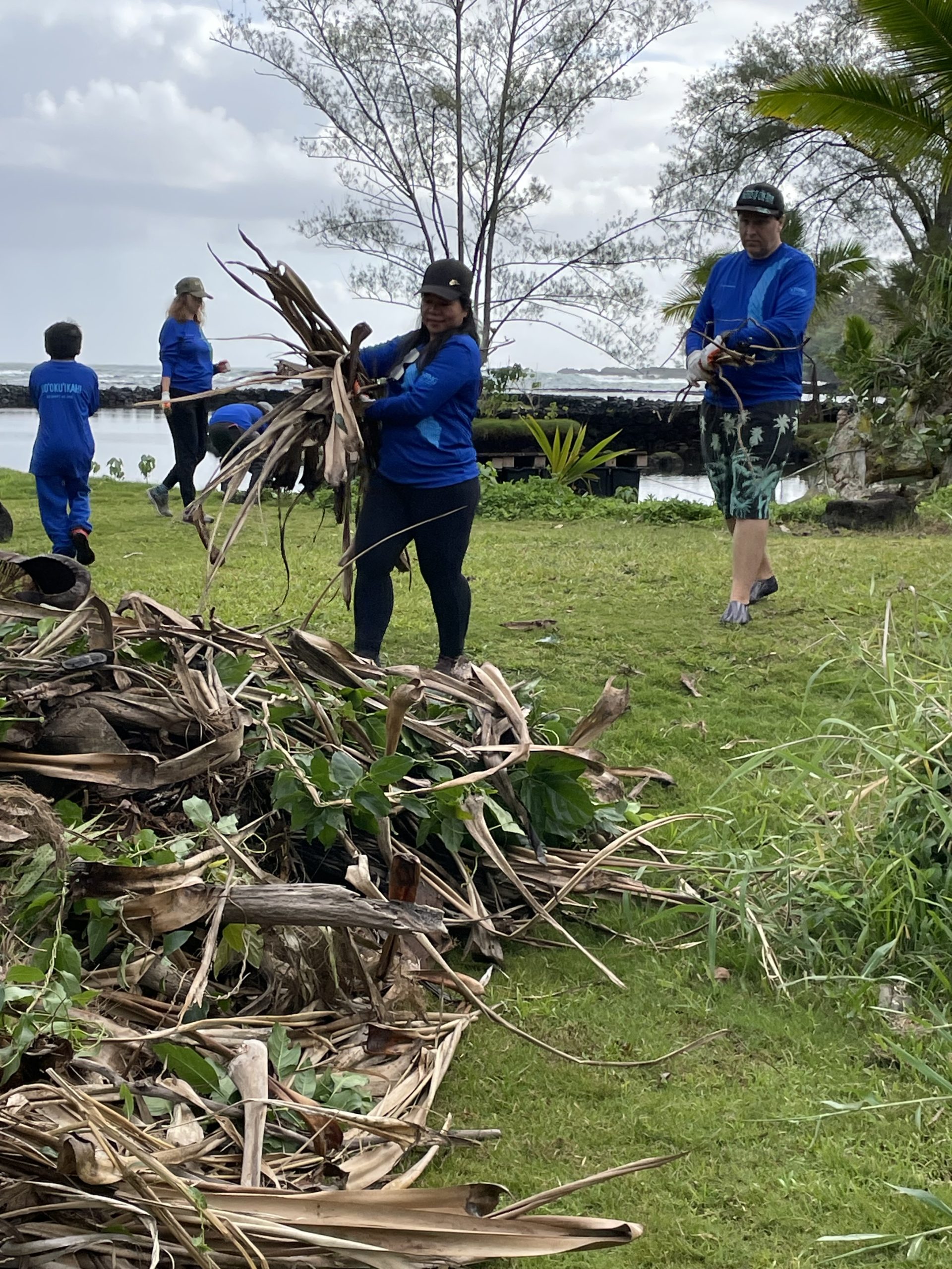 On the Hilo side of the island, volunteers returned to the Haleolono fishpond at Kamokuna in Honohononui for the eighth consecutive year to support coastal restoration efforts. Working alongside the Edith Kanaka‘ole Foundation, participants focused on removing invasive plant species and repairing sections of the historic fishpond wall – an important cultural and ecological resource for the community.