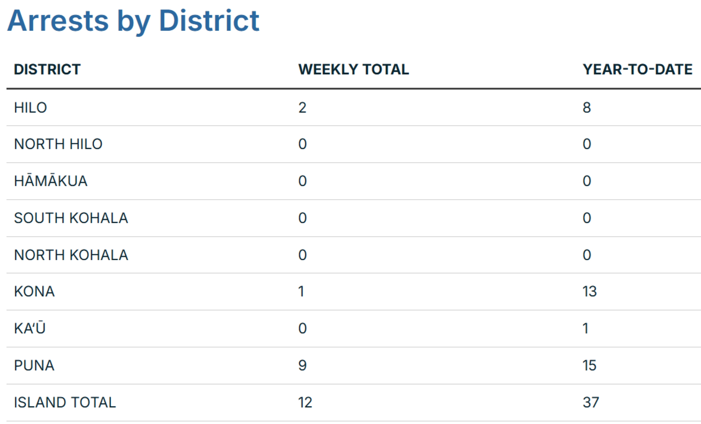 Hawai‘i Island police arrested 12 more motorists for driving under the influence during the week of Jan. 12-18 on Big Island roadways, bringing the total number of DUI arrests so far this year to 37.