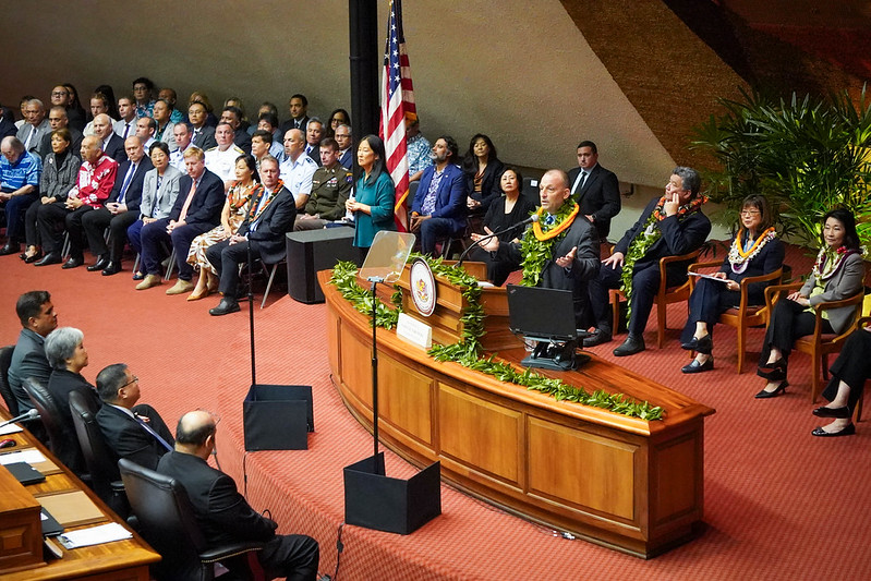 Following a Hawaiian oli (chant) during Monday’s State of the State address in the House Chamber in Honolulu, Hawai‘i Gov. Josh Green shared his administration’s past successes and his ongoing vision to lower the cost of living, address affordable housing and homelessness, grow the economy and protect the environment.