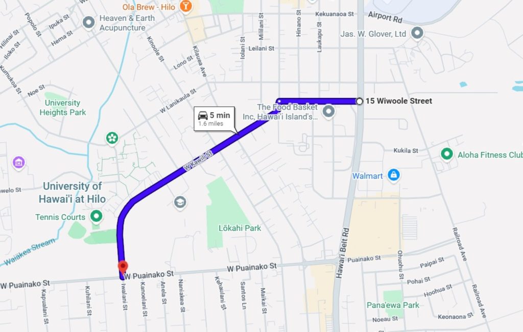 Between University of Hawaiʻi at Hilo middle entrance and Pūʻainakō Street