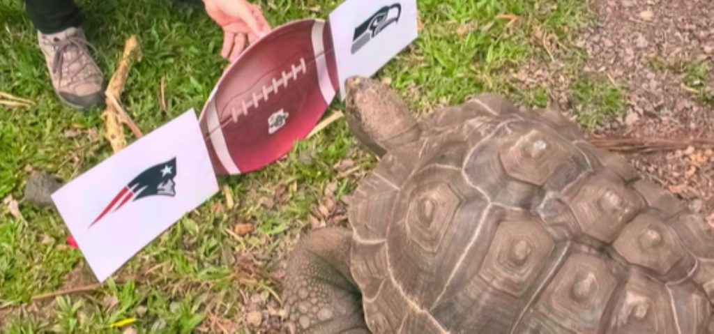 Aldabra tortoise Darwin clearly chose the Seahawks. Catalina macaw Max proudly picked New England.