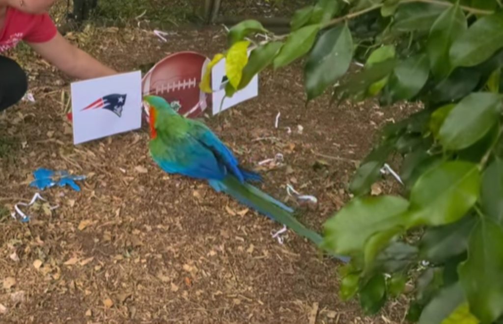 Catalina macaw Max proudly picks New England as winner of this year’s Super Bowl game. (Screenshot of video on Friends of the Pana‘ewa Zoo Facebook page)