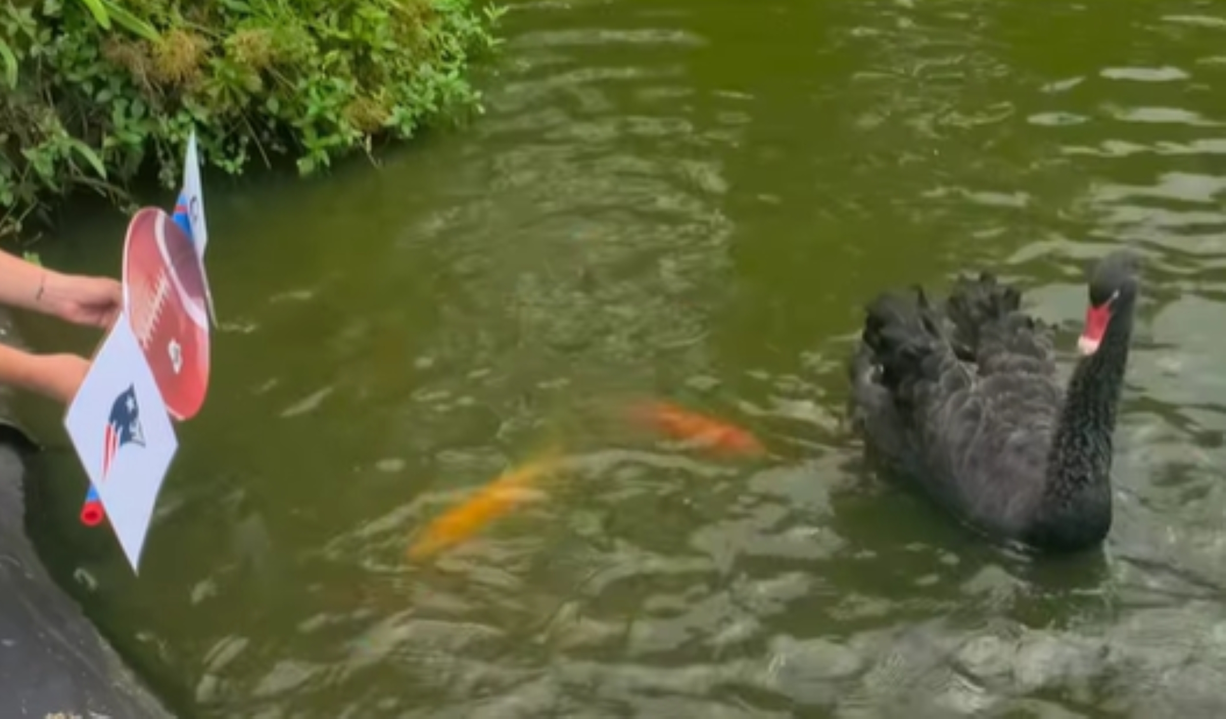 Black swan Swannie shrugs off making a choice for winner in this year’s Super Bowl matchup between the Seattle Seahawks and New England Patriots as she swims by the choices at Pana‘ewa Rainforest Zoo in Hilo. Her underwater koi fish friends, however, picked Seattle as this year’s victor after Swannie was out of the picture. (Screenshot of video on Friends of the Pana‘ewa Zoo Facebook page)