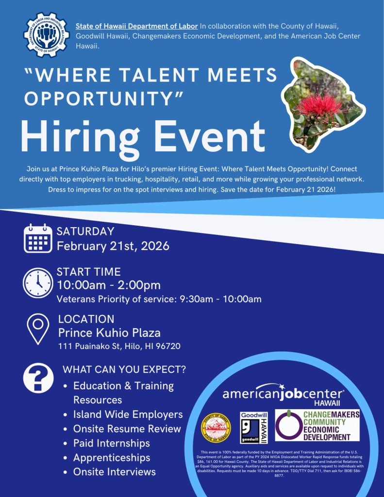Hawaiʻi County Department of Research and Development — in partnership with Hawaiʻi Department of Labor and Industrial Relations, Goodwill Hawaiʻi, Change Makers Economic Development and American Job Center — invite Hawaiʻi Island residents to a hiring event “Where Talent Meets Opportunity.”