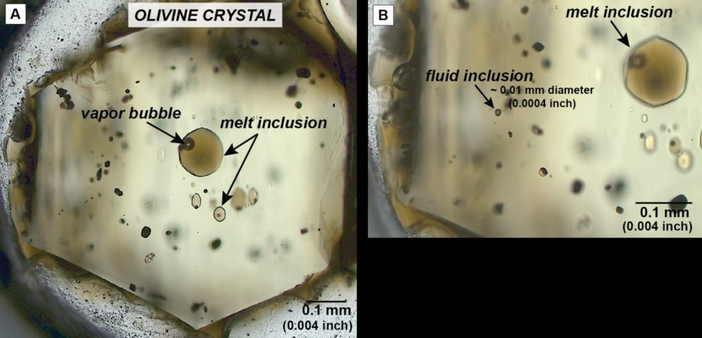Melt inclusions contain the magma, in solid form, while fluid inclusions can contain drops of water, carbon dioxide and sulfur dioxide in the liquid or gas phase.