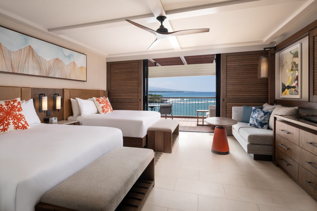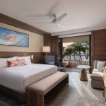 Throughout both hotel wings, rich woods, handcrafted textiles inspired by Hawaiian weaving and quilting traditions, ceiling fans and plantation shutters in guestrooms, expansive glass lānai doors, bedside lighting control panels and bathrooms with deep soaking tubs were introduced.