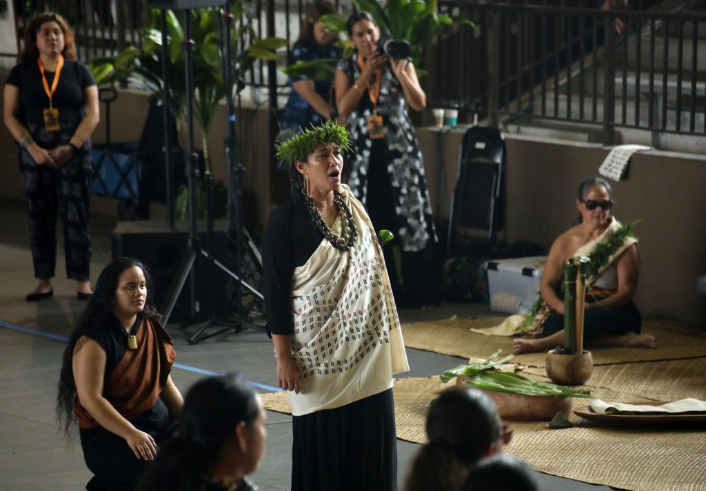Before the speakers, Hālau o Kekuhi started the hoʻolewa with oli and offerings to a kuahu, which is a sacred, temporary shrine that acts as a portal for divine inspiration and a physical, spiritual center for hula dancers. Her family then took part in an ʻawa ceremony, which is a sacred ritual to honor the deceased and create a bridge between the physical and spiritual worlds.