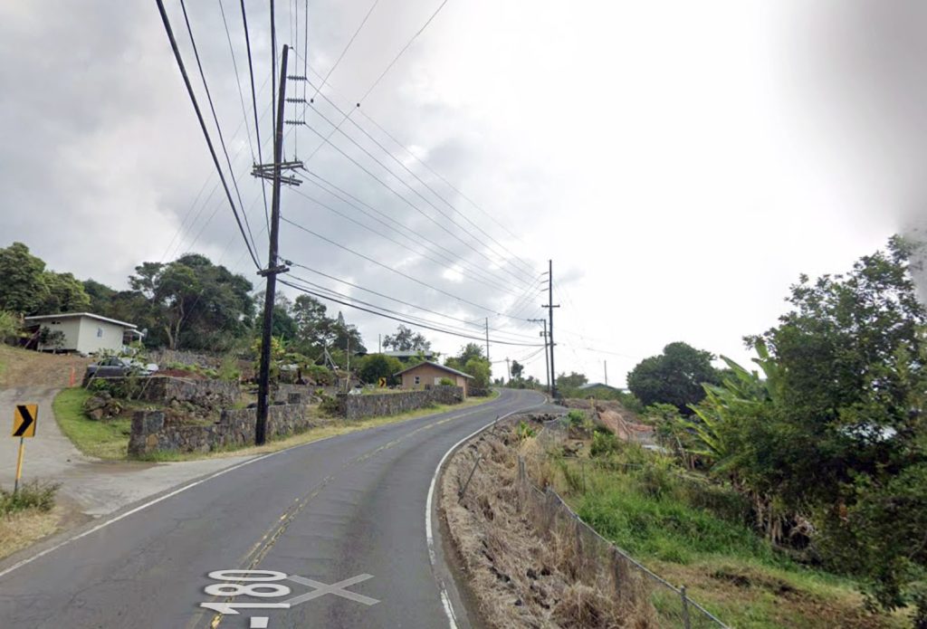 In this screenshot, utility poles are seen on Māmalahoa Highway near Nohealani Street in Keauhou.