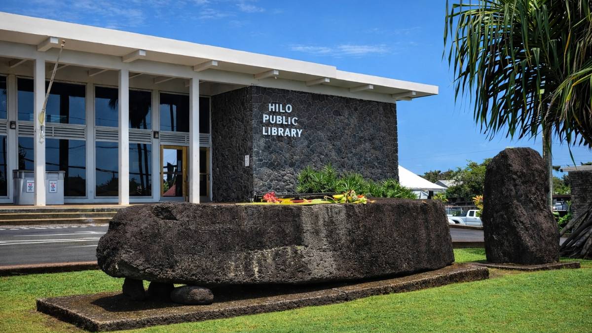 The Hilo Public Library, located at 300 Waiānuenue Ave., opened on Jan. 20, 1951. For decades, it has stood in the presence of the legendary Naha Stone, which is believed to be the stone lifted by Kamehameha I in fulfillment of a prophecy that he would unite the Hawaiian Islands.