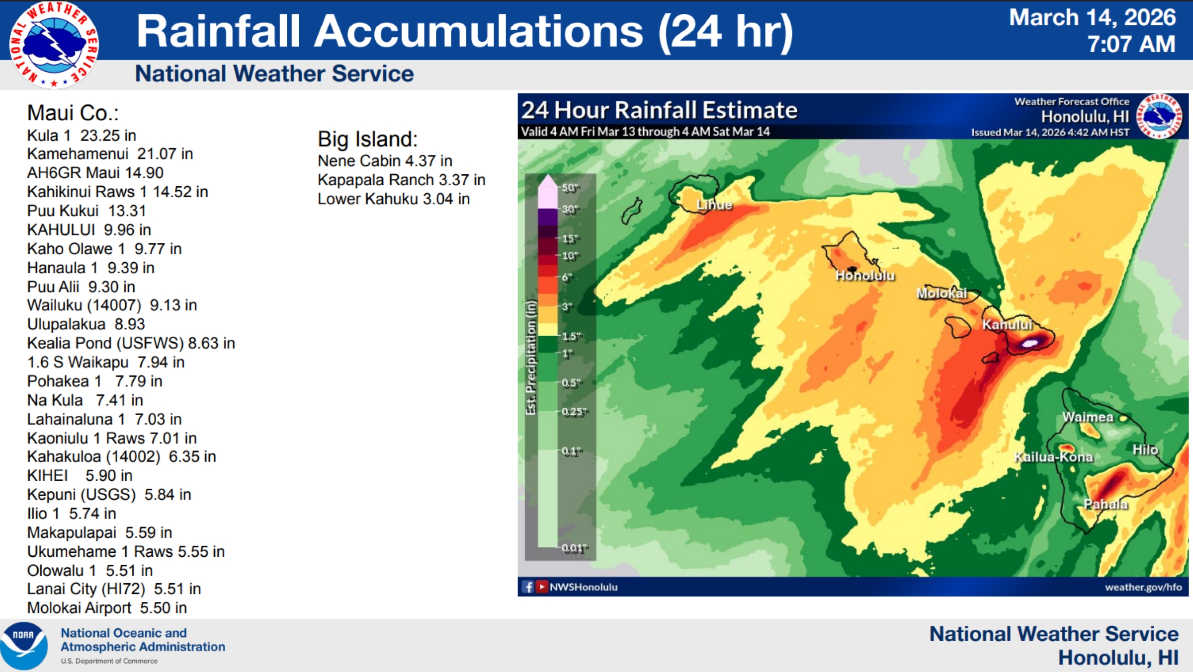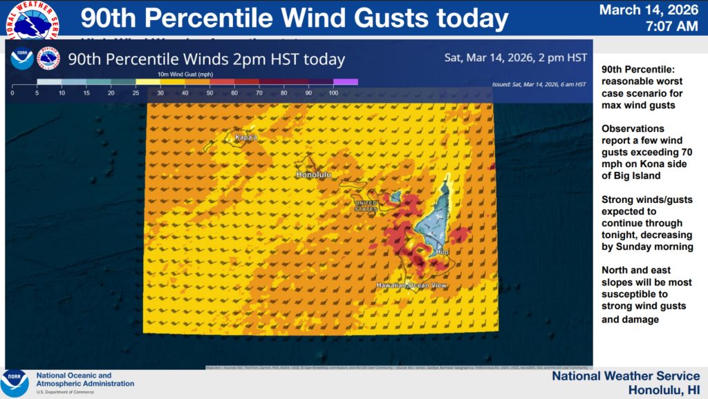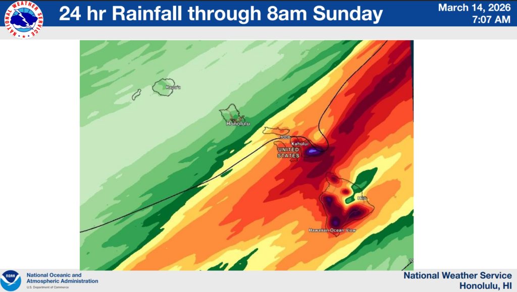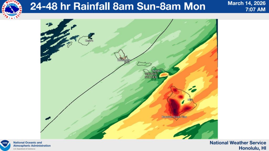 Very strong wind gusts were already reported in Kona overnight Friday (March 13) into today. Rain also will focus over the Big Island through Sunday night (March 15).