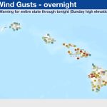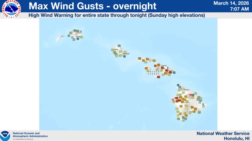 High wind warning: Southwest winds of 30 to 40 mph, with gusts up to 70 mph, are now expected through Sunday evening (March 15) as the high wind warning in effect for lower elevations of the Big Island was extended by the National Weather Service. Areas most at risk are communities north and east of steep mountain terrain, including Kona and Ka‘ū. Southwest winds of 55 to 75 mph, with gusts up to 110 mph, are also forecast through Sunday evening for the Big Island summits of Mauna Kea and Mauna Loa.