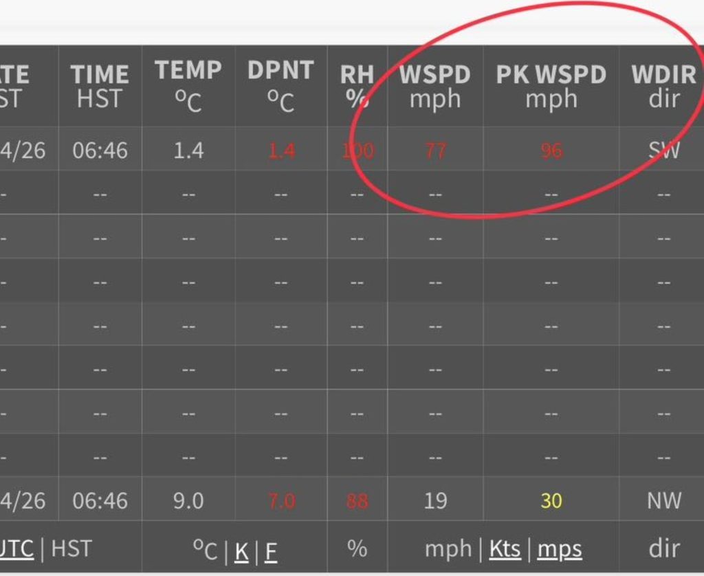 Maunakea Visitor Information Station updated shortly before 7 a.m. today on its Facebook page that stormy conditions are reported on Mauna Kea’s summit this morning, with 77 mph winds and 96 mph gusts — “down from 118mph!!!”