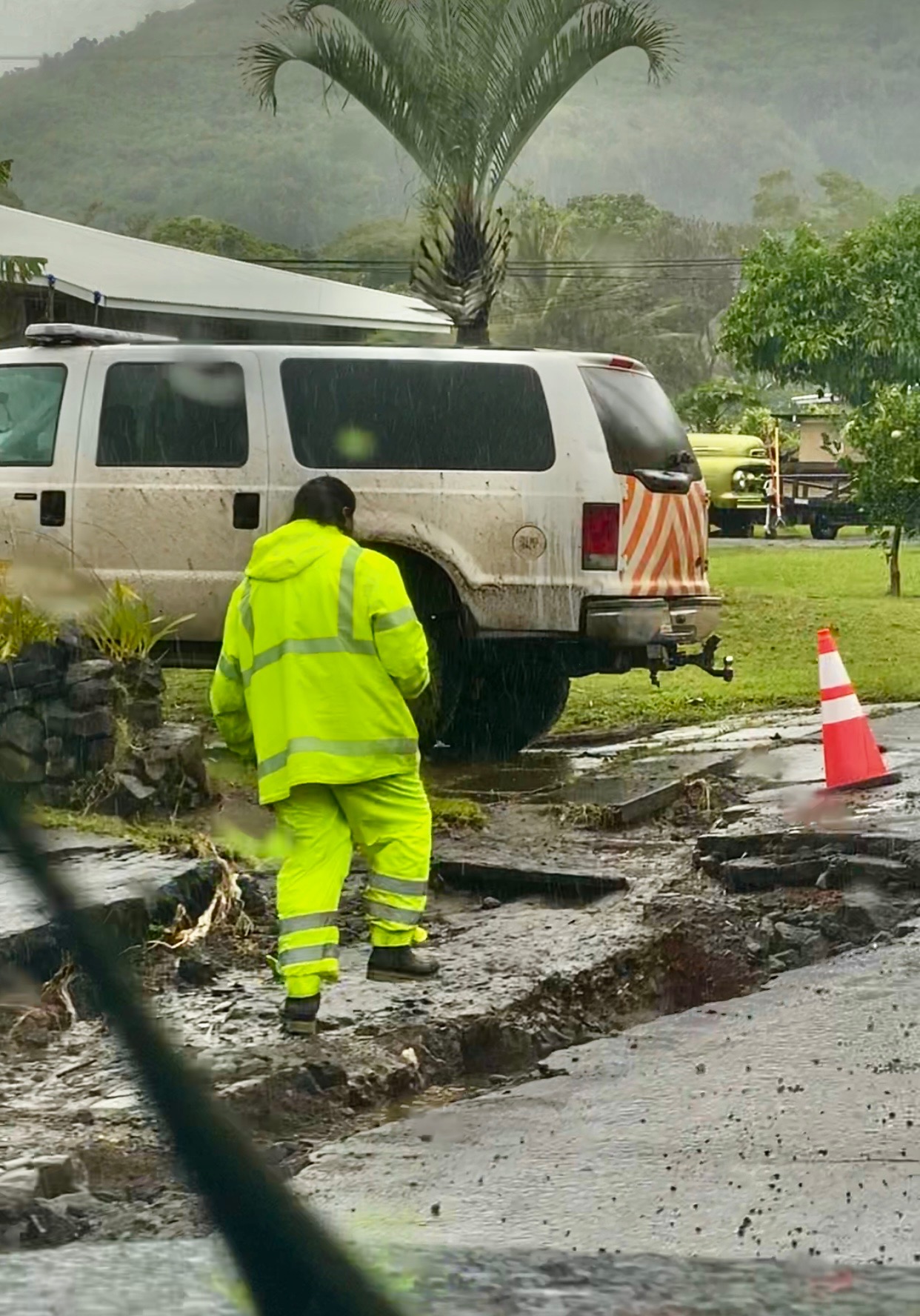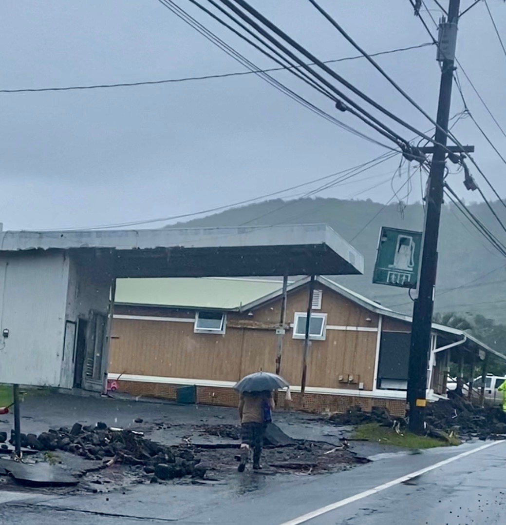 Video captured by Inserra of the storm’s aftermath showed broken-up asphalt by the old Wong Yuen Store off Highway 11, gaping potholes and boulders in the roadway. She also some flooding underneath her post-and-pier home.