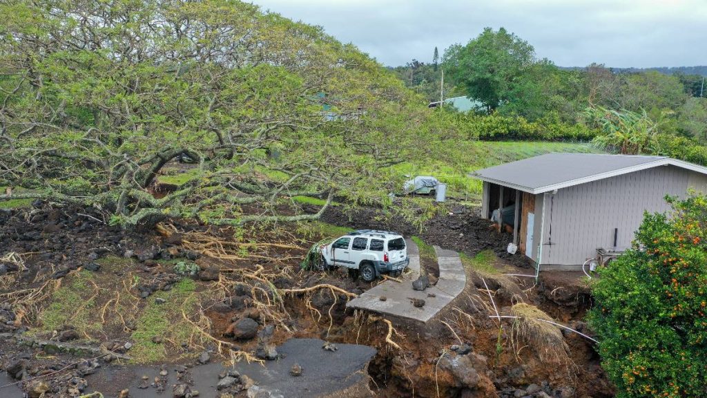 Greenwell, owner of Greenwell Farms in South Kona, said the storm took out the farm’s water supply. Images of his driveway showed exposed roots of a large monkey pod tree, broken asphalt on the driveway and cracked earth carved up by the raging flood waters.
